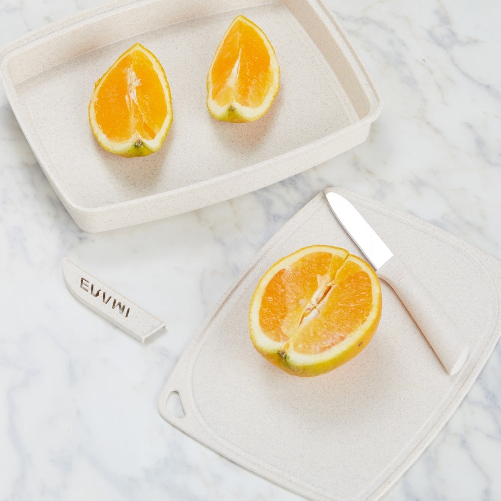 Inclui tesoura culinária, faca com protetor e descascador de legumes, e acompanha bandeja com tampa que serve tanto como recipiente para armazenar quanto como tábua para cortes, otimizando seu espaço e organização na cozinha.