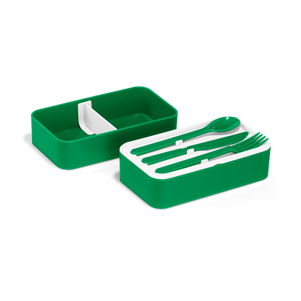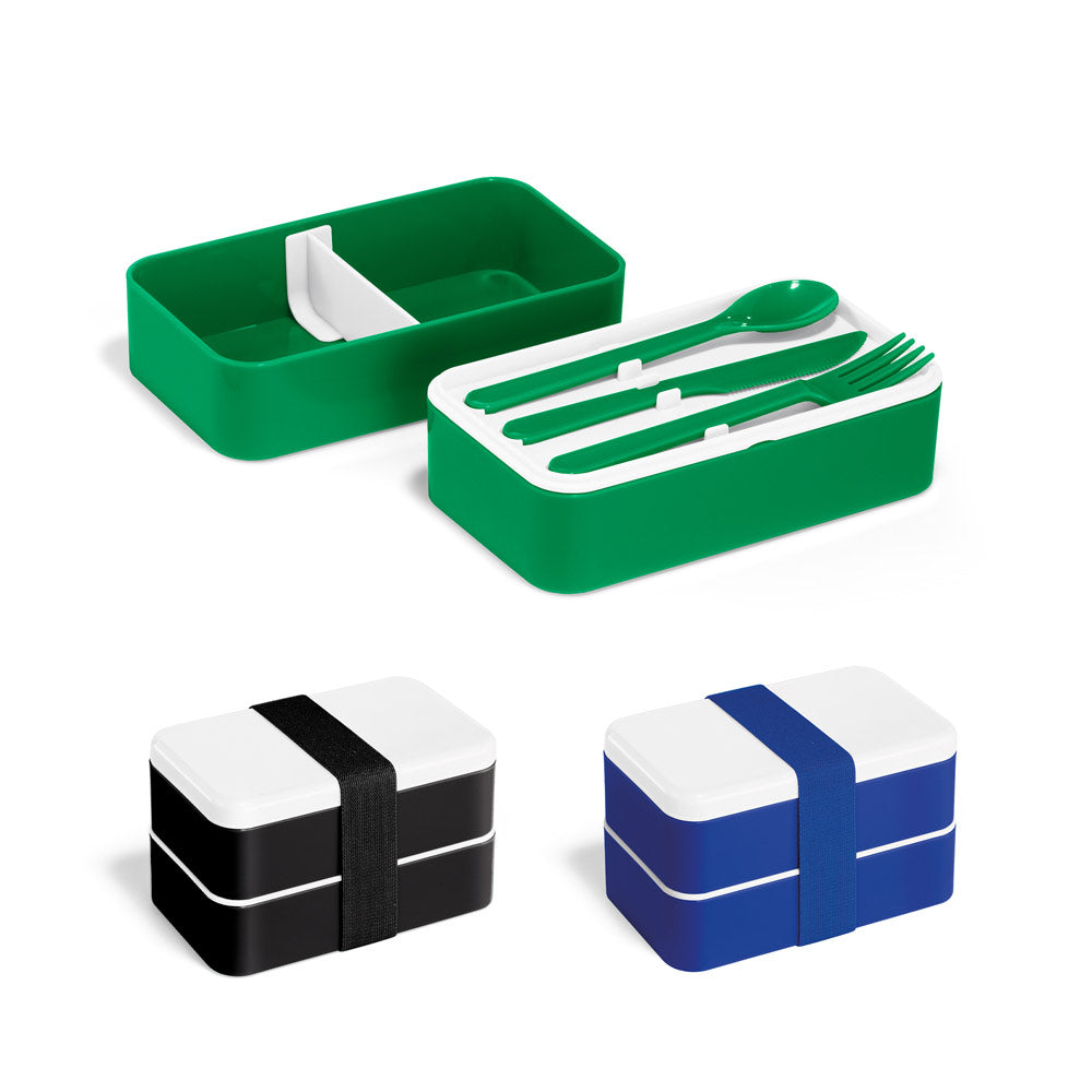 Feita em PP e PS, acompanha um conjunto de 3 talheres (garfo, faca e colher) e fecha com banda elástica para maior segurança.