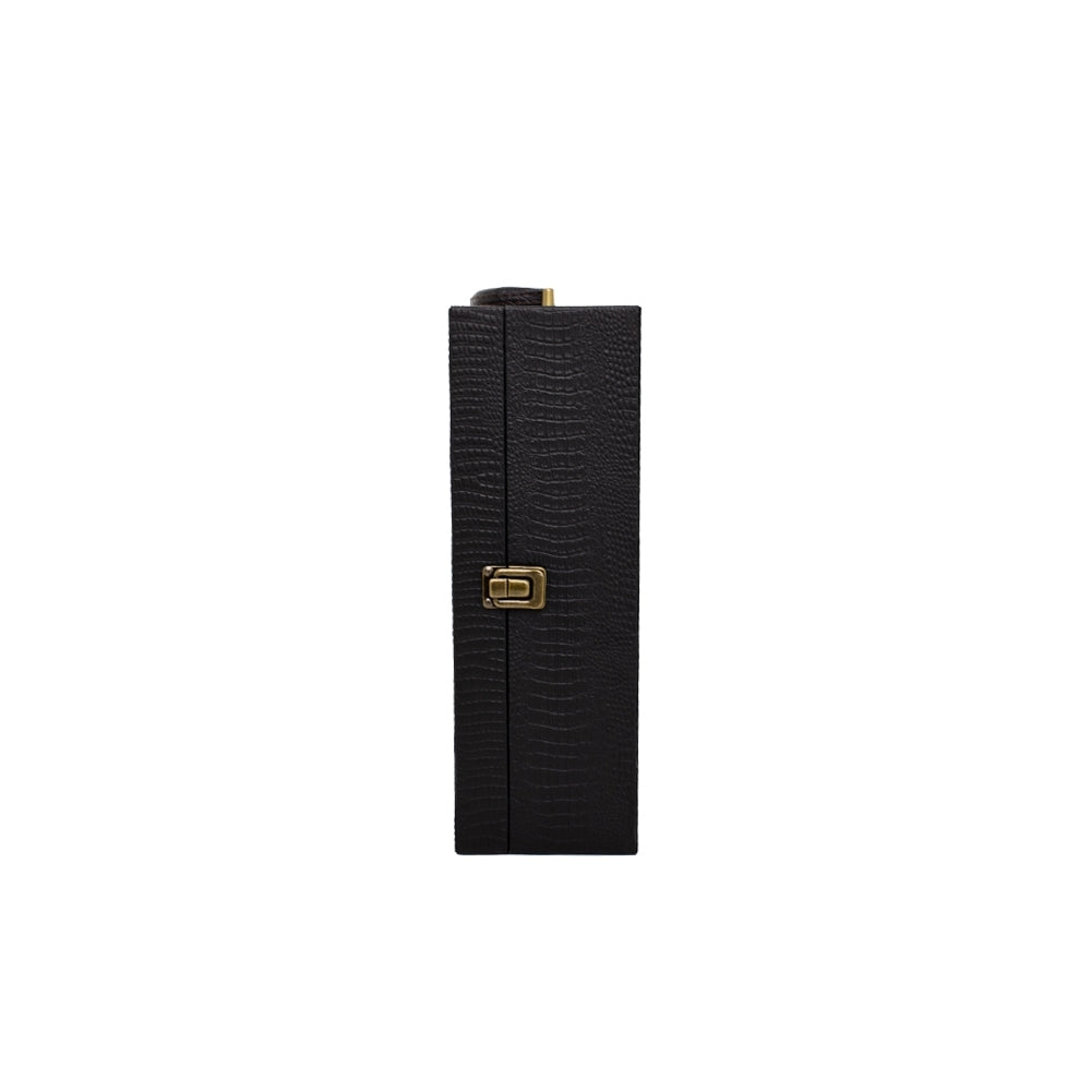 Kit de vinho CACIOLI em maleta de couro sintético com quatro peças essenciais: saca-rolhas metálico, bico condutor com tampa, cortador de lacre e wine collar.