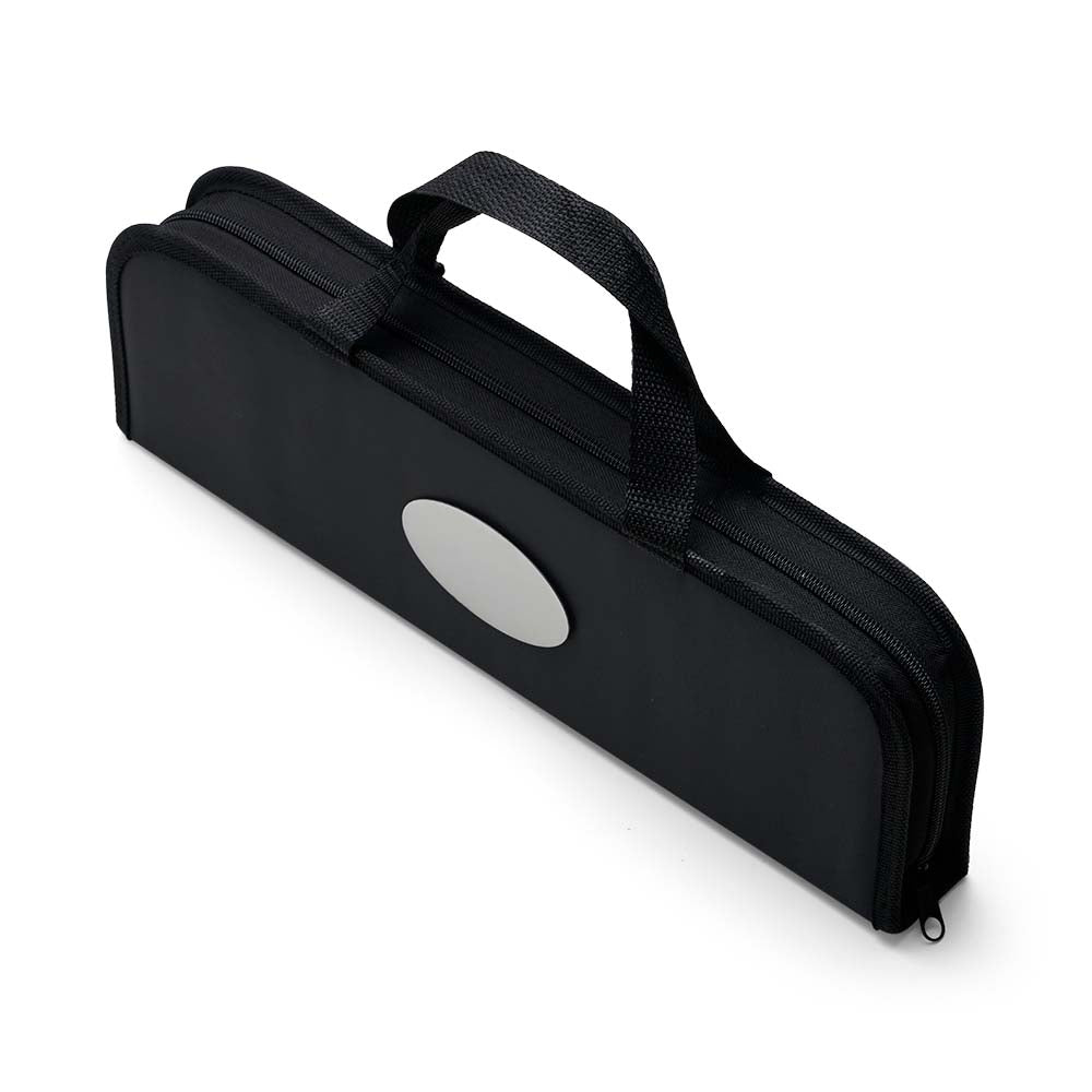 Kit Churrasco DOMINGO III reúne 17 peças em um estojo de nylon compacto, com alça para facilitar o transporte e plaquinha para personalização.