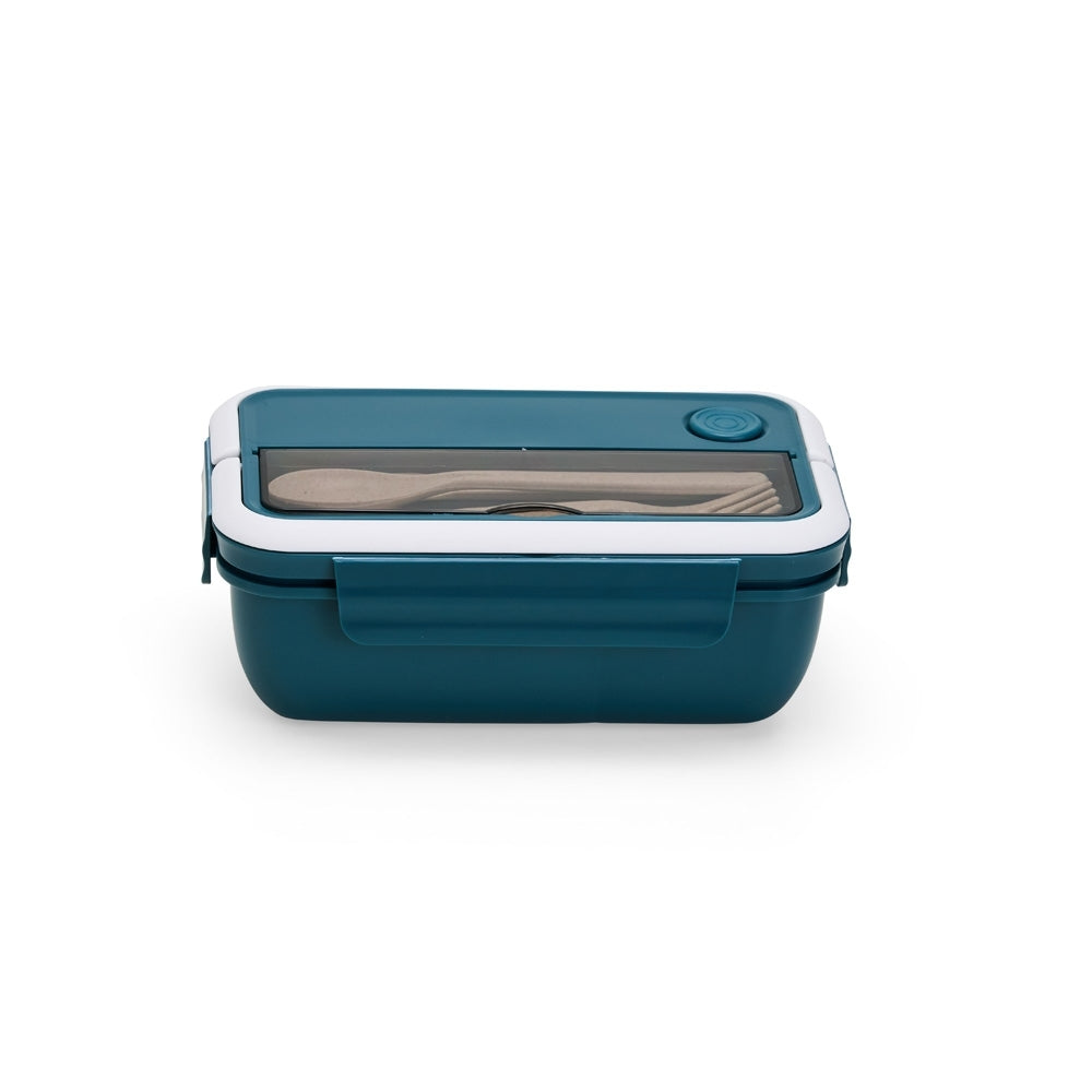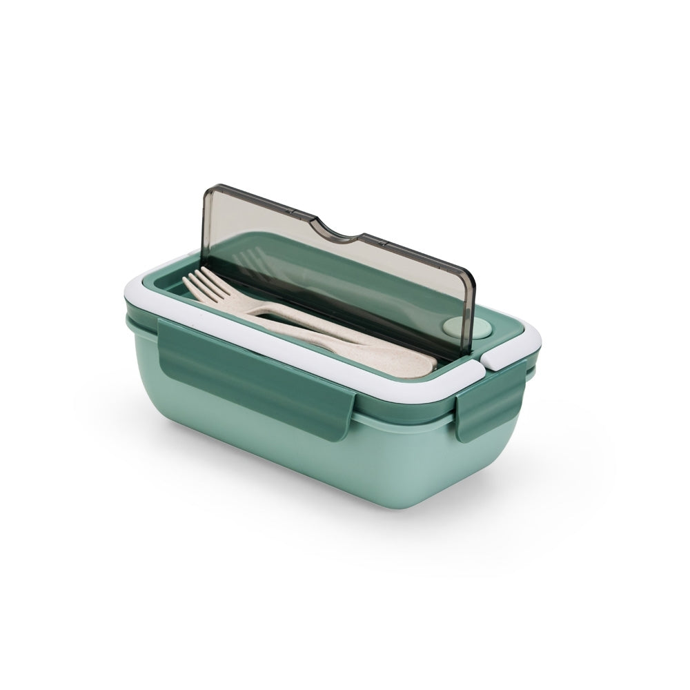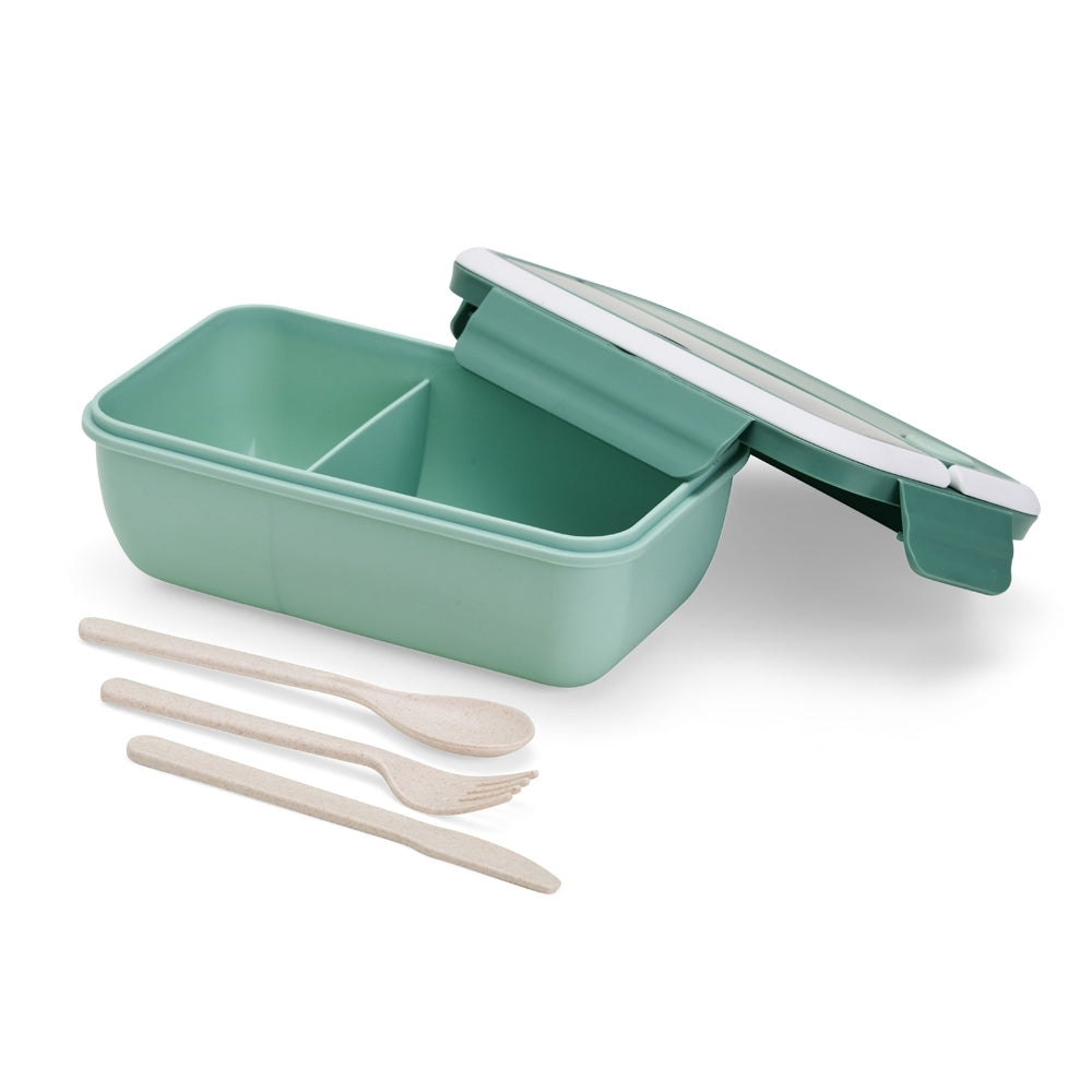 Suas duas divisórias internas separam cada alimento, enquanto os três talheres acompanhados de compartimento próprio facilitam o uso e armazenamento.