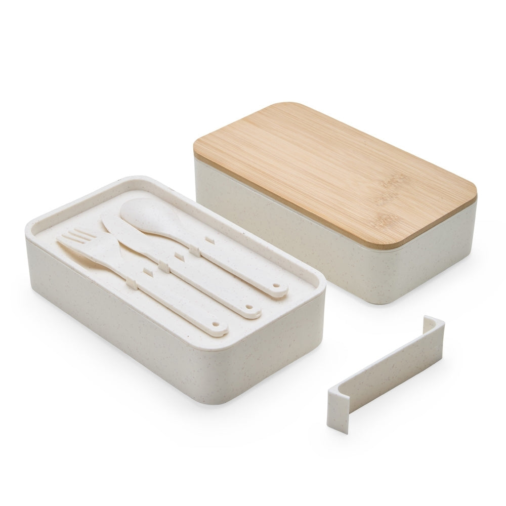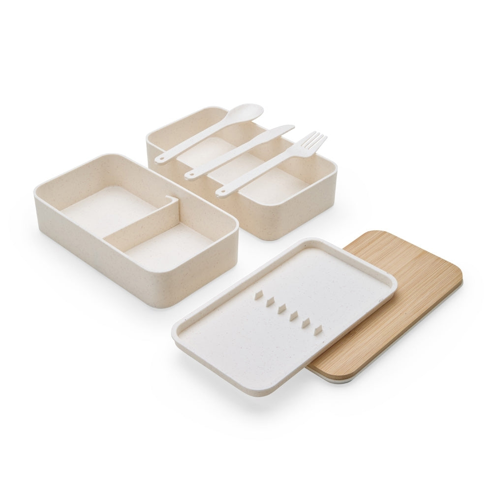 Marmita dupla RIO TINTO II em fibra de trigo livre de BPA com um compartimento de 600ml com tampa de bambu e outro de 500ml com suporte para os 3 talheres.