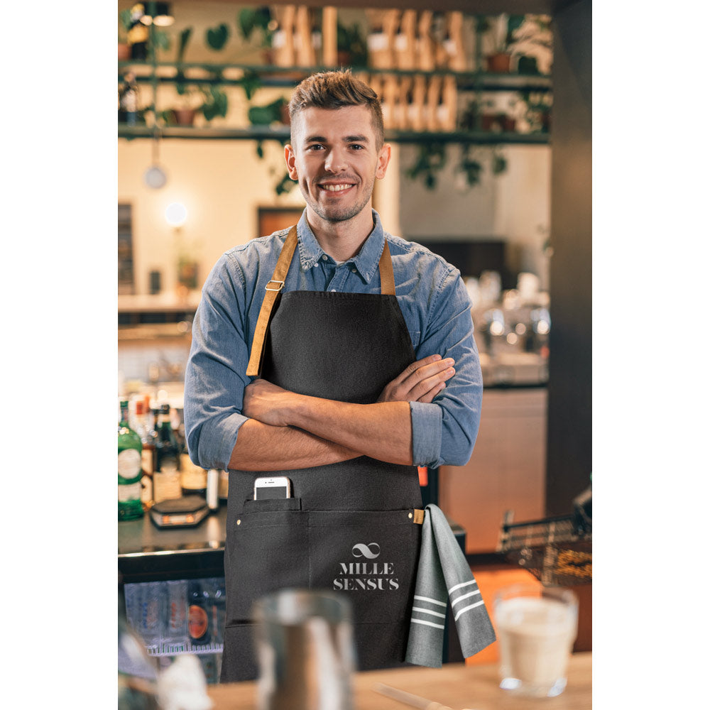 Avental SUNFLOWER em 100% algodão canvas grosso (300 g/m²), com seus três bolsos multifuncionais que facilitam o acesso a utensílios, enquanto a tira lateral oferece praticidade para pendurar um pano de cozinha.